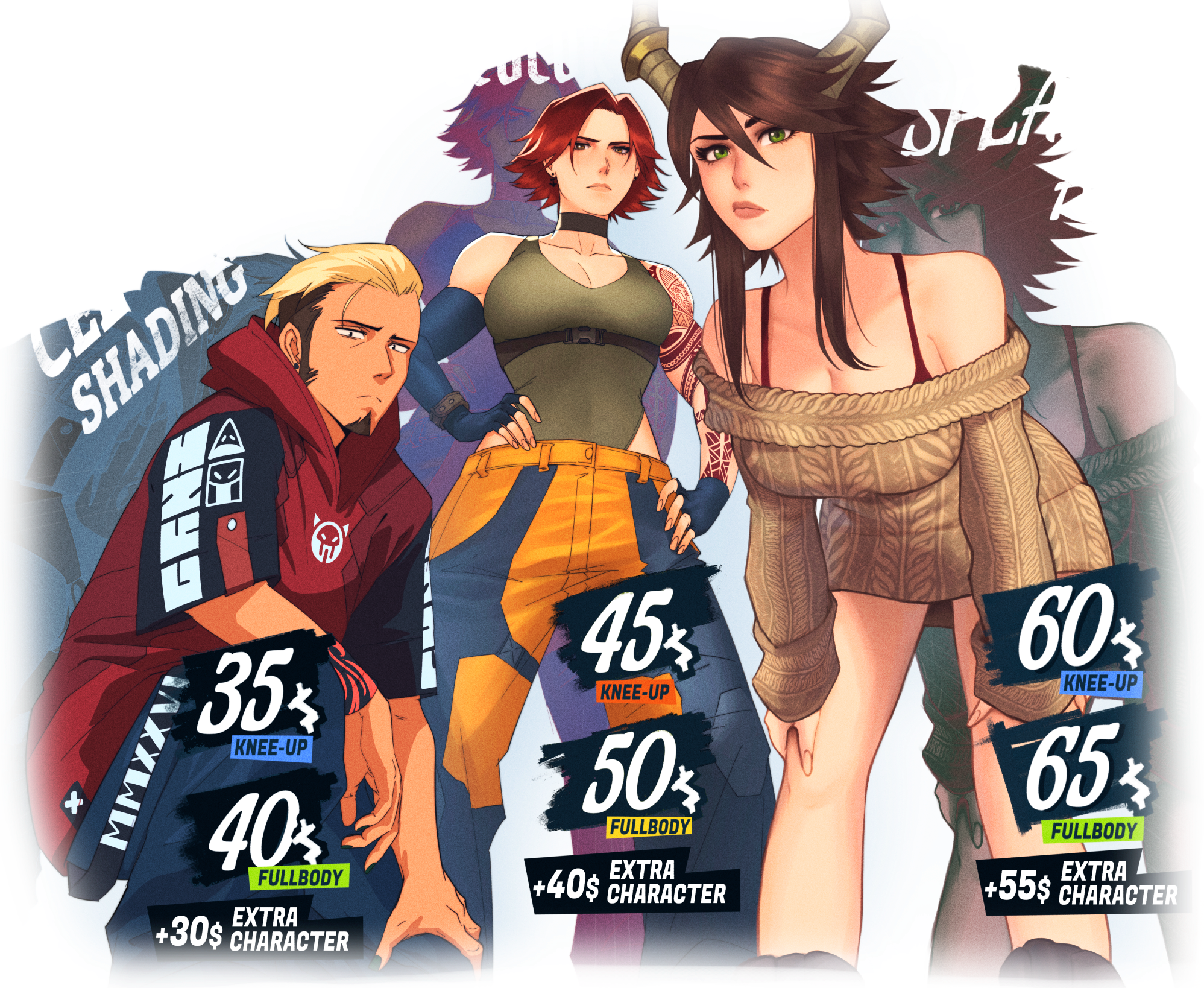There might be extra charges depending on how complex the commission is (characters, props, scene etc.).
